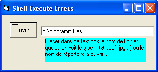 Voici un code, permettant d'utiliser la fonction API ShellExecute, pour ouvrir un dossier (dans explorateur windows) , ou un fichier dans l'application associée (le bloc note pour un .txt, Word pour un .doc...) .. et tout cela en gérant l'erreur sur la non disponibilité du fichier .. (inexistant, pas d'association.....)