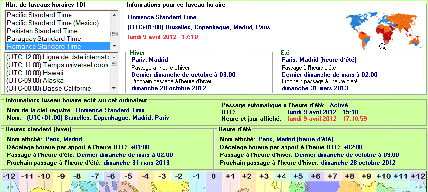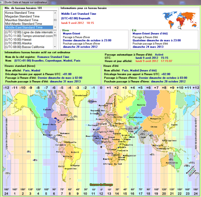 Visualisation des paramétrés fuseau horaire en cours sur l'ordinateur et affichage de l'heure locale du fuseau sélectionné dans une des 2 listes.
