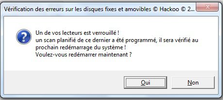 un message va vous informer que [b]"un scan planifié de ce dernier a été programmé, il sera vérifié au prochain redémarrage du système"[/b], et qu'il faut redémarrer. Alors, redémarrer et le disque sera vérifié et réparé au besoin.